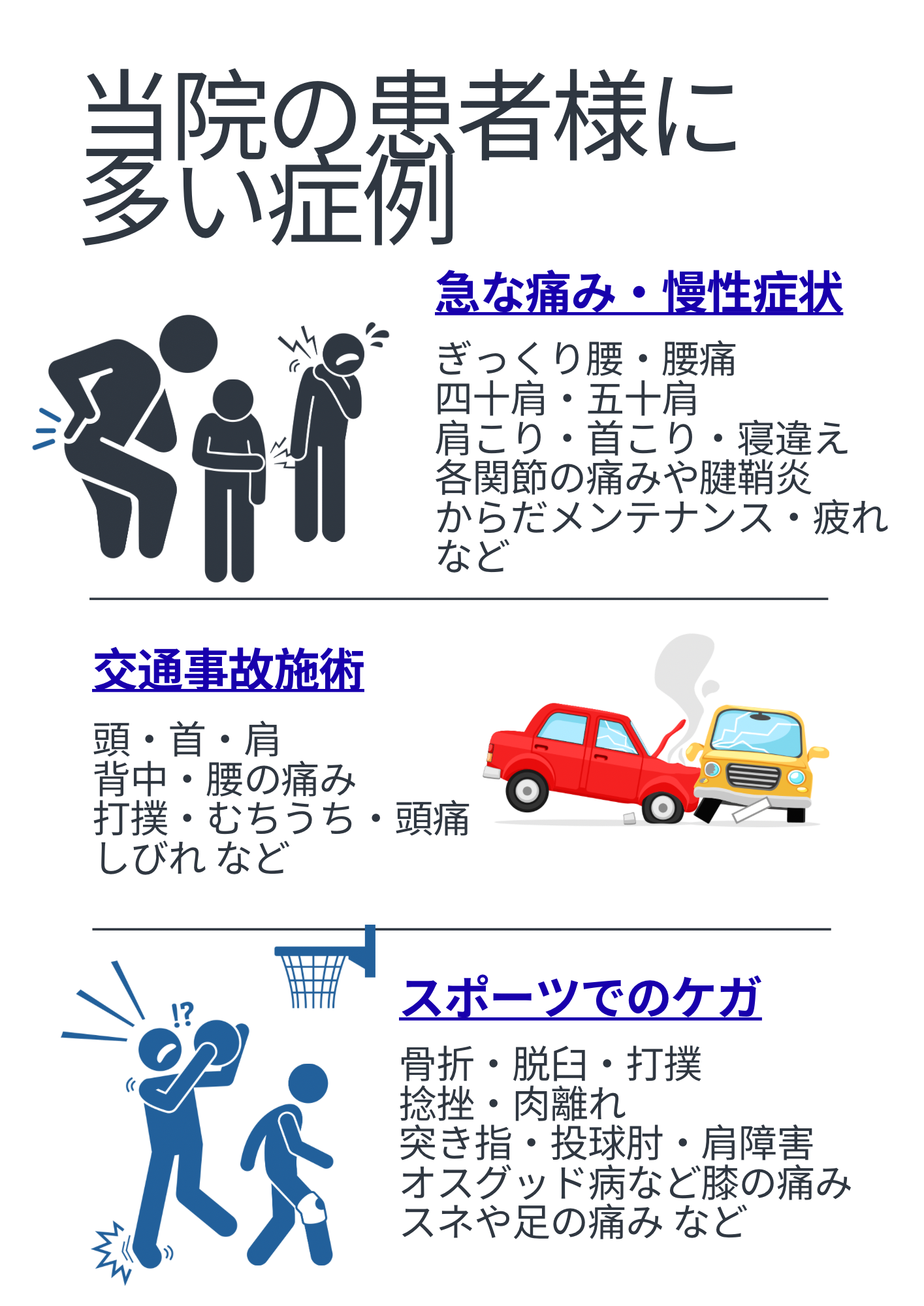 むちうちやしびれ、めまいや吐き気、その他身体の痛みなどの症状に対して徒手施術や物療機器などによる多角的なアプローチで痛みの改善に努めています。